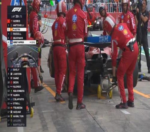 安全车结束后,皮亚斯特里、安东内利、勒克莱尔三车并排,皮亚斯特里碰到安东内利,后者碰到勒克莱尔左前轮,勒克莱尔退赛!