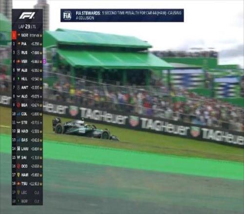 汉密尔顿因引发与科拉平托的碰撞被罚5秒