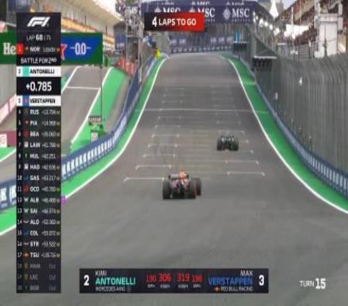 第六十八圈:维斯塔潘已经距离P2的安东内利不足一秒