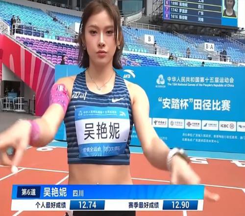 吴艳妮这一枪跑得很稳健,并没有完全发力,但还是稳稳地领先,最终跑出了12秒98的成绩,位列小组第一,并且是预赛总成绩第一。
