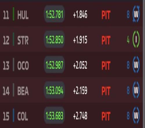 Q2上来皮亚斯特里一度刷紫,不过随着赛道变干,劳森和哈贾尔先后来到榜首,诺里斯也反超皮亚斯特里来到第三的位置。Q2结束时,拉塞尔冲到第一位,皮亚斯特里险些被淘汰。被淘汰的是霍肯伯格、奥康、比尔曼、克拉平托以及用半雨胎跑了4圈的斯特罗尔。