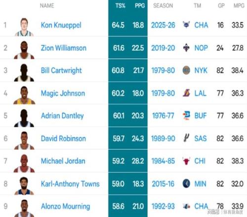 截至现在,克尼佩尔的真实命中率高达64.5%,在NBA新秀里那可是独占鳌头,说是NBA历史上真实命中率最高的新秀球员都不为过。排在他后面的,那可都是NBA响当当的大神级名宿(胖虎咱就先不把他算进去啦)。