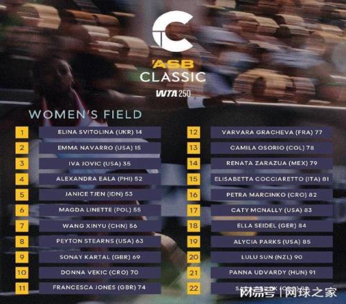 我们再来关注明年的开年赛事。北京时间昨晚,新赛季的两站WTA赛事官宣了参赛阵容。其中,WTA250奥克兰站:斯维托丽娜、纳瓦罗、约维奇、伊埃拉、曾丽美、王欣瑜、维基奇、孙璐璐等球员出战,大威廉姆斯、斯蒂芬斯、博尔特持外卡参赛。这项赛事将于明年1月5日--11日进行。