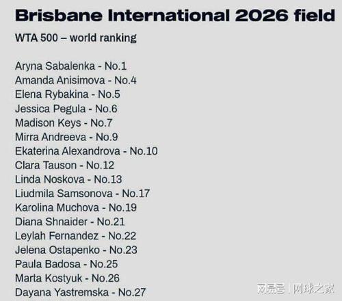 WTA500布里斯班站:世界第一、卫冕冠军萨巴伦卡领衔,阿尼西莫娃、莱巴金娜、佩古拉、凯斯、米拉-安德列娃、亚历山德洛娃等名将新星都榜上有名。前赛会冠军、捷克名将卡-普利斯科娃的名字也出现在参赛球员名单中。这项赛事将于明年1月4日--11日进行。