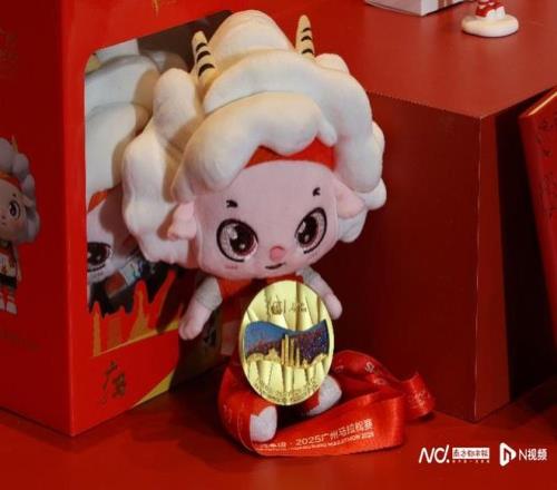 广马吉祥物“马拉糕”与今年的完赛奖牌。南都N视频记者梁炜培 摄