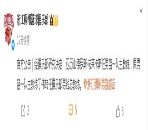 如今浙江男篮官方公告写道:“官方公告|经俱乐部研究决定,亚历山德罗斯-法莱卡斯任男篮一队主教练,原男篮一队主教练丁伟转任俱乐部男线总教练。”